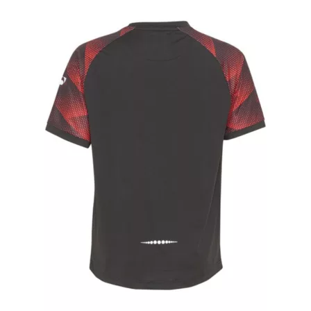The T-shirt is simple and stylish with a black look with red details on the shoulders.