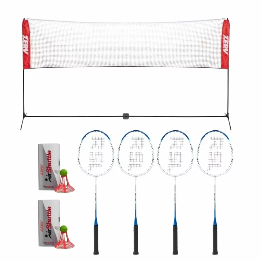 This set includes 4 ZERV Bolt 22 rackets, 1 badminton net, and 2 tubes with 3 ZERV Air Shuttle II outdoor shuttlecocks each.