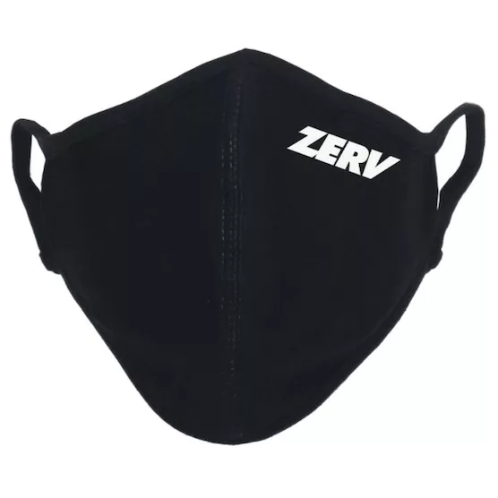 This black facemask from ZERV is a 3-layer fabric facemask for adults, in the color black and with a white ZERV logo.